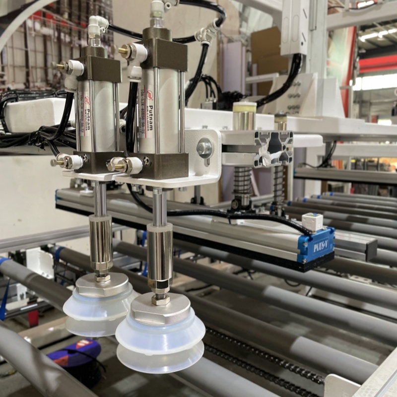 4. துயரப்படுத்துதல்: செயலாக்க கருவிகளின் நியமிக்கப்பட்ட நிலைக்கு குழு வழங்கப்பட்டவுடன், உறிஞ்சும் கோப்பைகள் ஏற்றுதல் செயல்முறையை முடிக்க வெற்றிடத்தை வெளியிடுகின்றன. அதே நேரத்தில்,